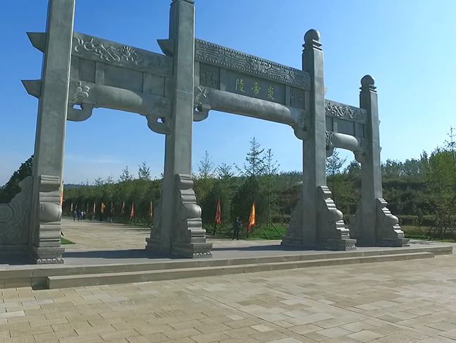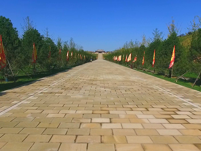 朝圣大道全长500余米,宽12米,整条大道全部为高平当地黄砂岩铺墁,象征5000年古老的中华文明。入口处采用四柱三坊式冲天石牌坊,宋式风格,高12米,宽24米,古意盎然,气势雄伟。牌坊摺柱花板正面摹刻“炎帝陵”三个金字,背面携四个行楷大字“福佑中华”。
